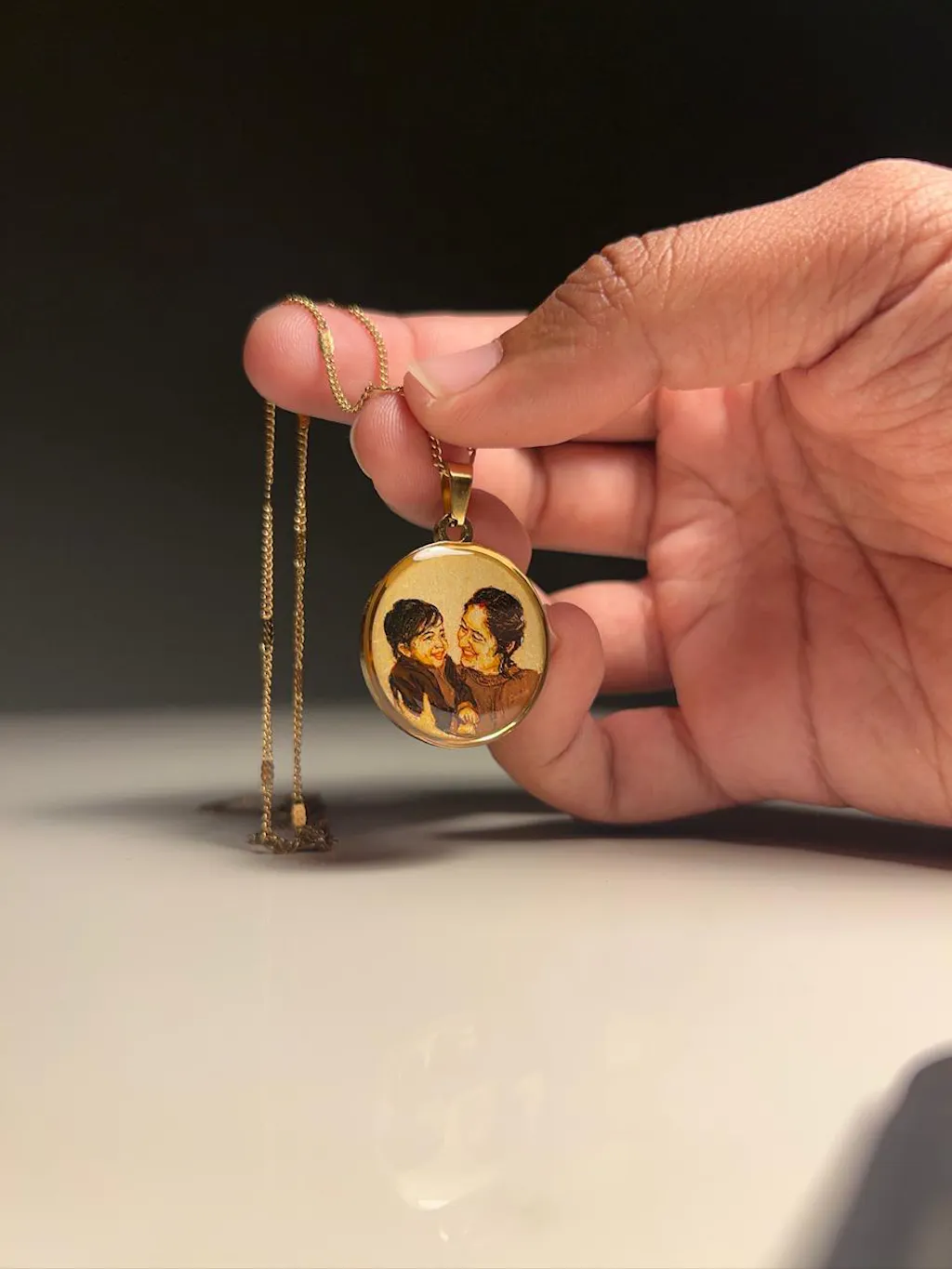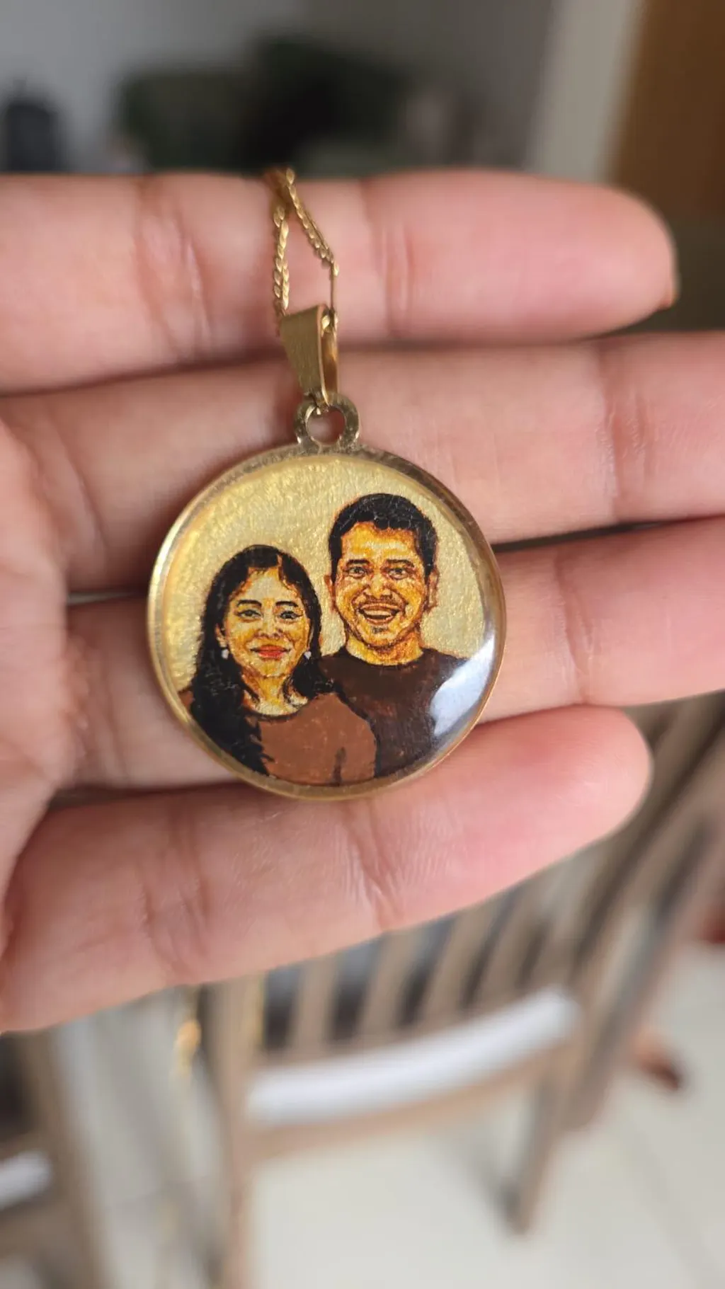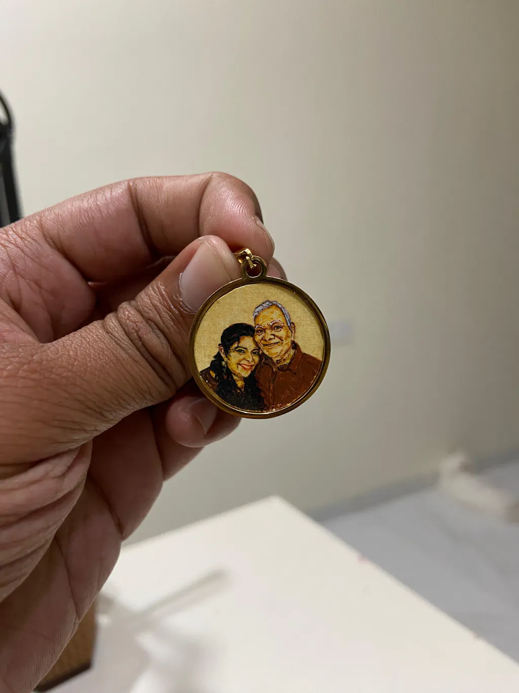 I recently ordered a custom hand-painted portrait necklace from AMAANSA Fine Arts Studio as a surprise gift for my wife, and I couldn’t be more impressed with the final piece. The pendant features a beautiful, detailed miniature painting of my wife alongside her father (my father-in-law), capturing one of their special moments together.